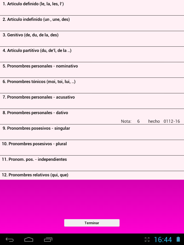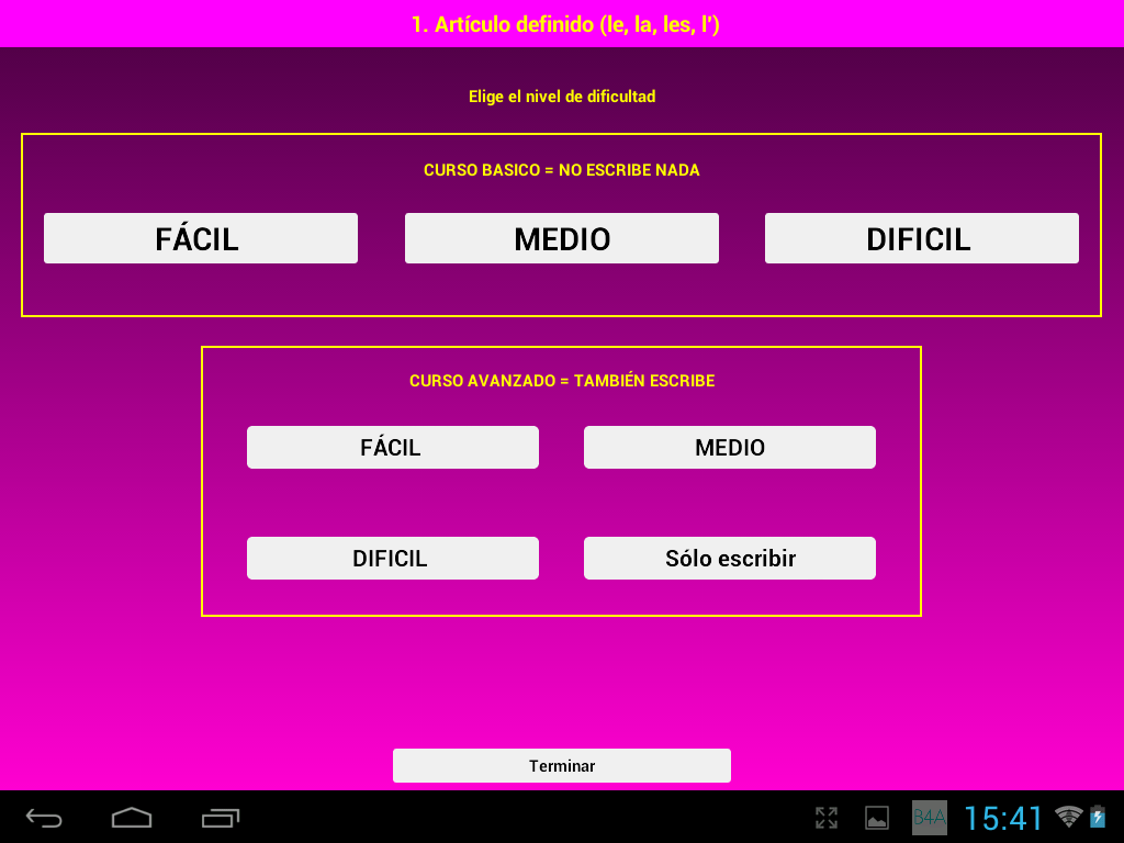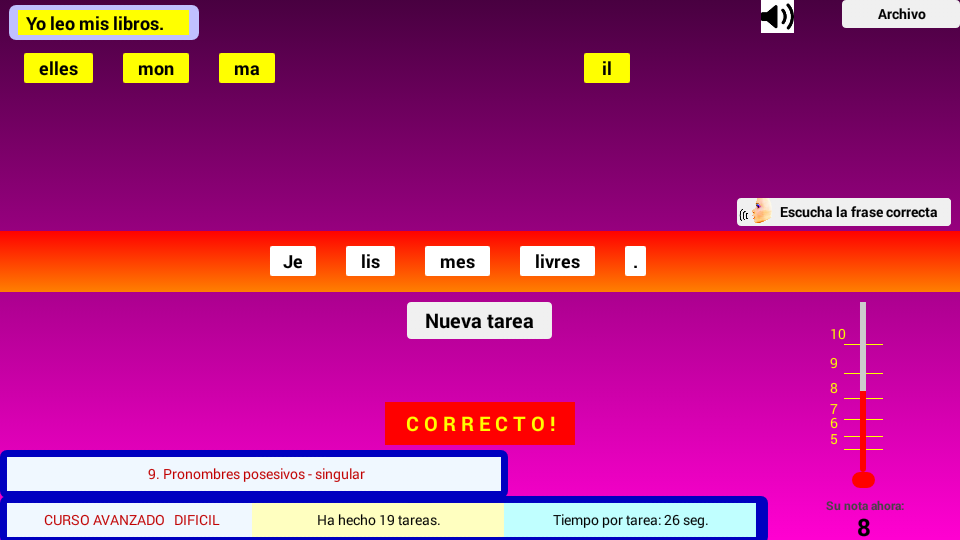 * Los ejercicios están organizados. El alumno elige una categoría gramatical específica.
